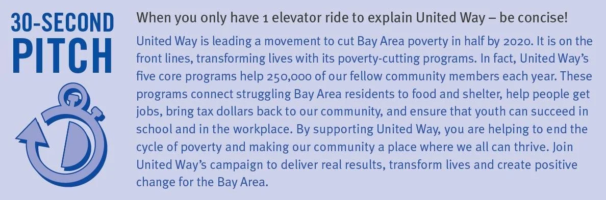 First, this is an elevator speech that someone could actually give in a short elevator ride. To the benefit of the listener, it is short enough that most people would probably listen attentively for the entire elevator speech. Equally important is that it is short enough that the average United Way of the Bay Area board member, staff member, or campaign coordinator could commit it to memory.