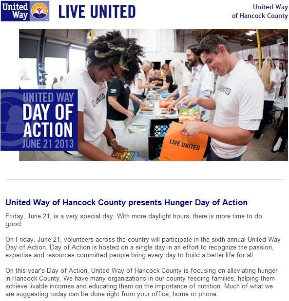 United Way of Hancock County sent out a newsletter, informing people that June 21st was their Hunger Day of Action, and that many organizations in their county are feeding families, helping them achieve livable incomes, and educating them on the importance of nutrition. They also informed people that they can help out with these efforts right from their office, home, or phone.