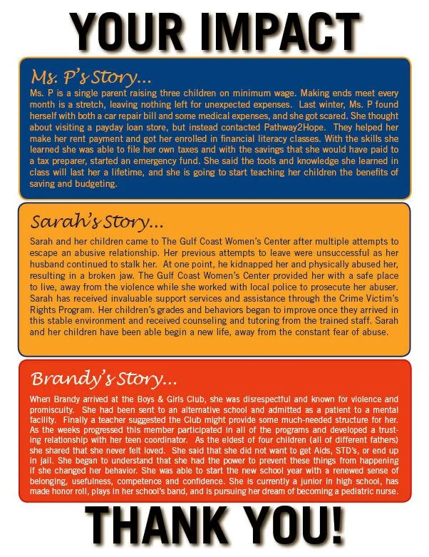 This is just one of the pages of their 2013 Donor Report; other pages include statistics about the education, income, and health challenges facing South Mississippi residents and another page includes information about volunteering and people involved with United Way of South Mississippi. The last page of the 2013 Donor Report includes stories about impact: