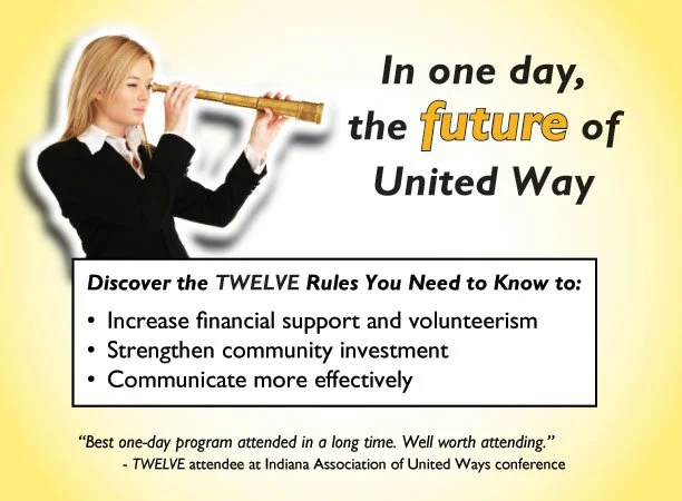 You don’t want to miss this opportunity! Sign-up to attend TWELVE: The New Rules for United Way Success in Lynchburg, Virginia on September 19th and invite your board, staff, and volunteers to join you! Click here to learn more about this workshop and to register. If your United Way is not located in Virginia or the surrounding area, but you are interested in bringing TWELVE: The New Rules for United Way Success to your United Way, contact us at twelve@perspectives4uw.com for details and pricing.