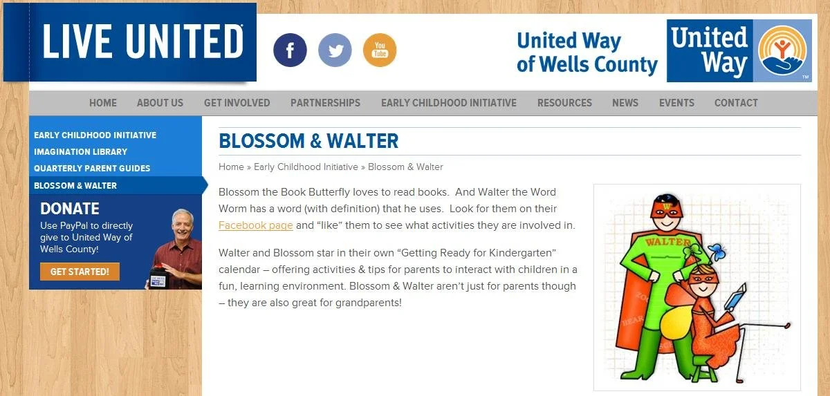 United Way of Wells County established a priority of ensuring all children are ready to enter Kindergarten and they are continually looking for ways to strengthen school readiness in all of their school districts. Walter and Blossom are part of their early childhood initiative and share their love of books and words, tips for learning, health, and having fun.