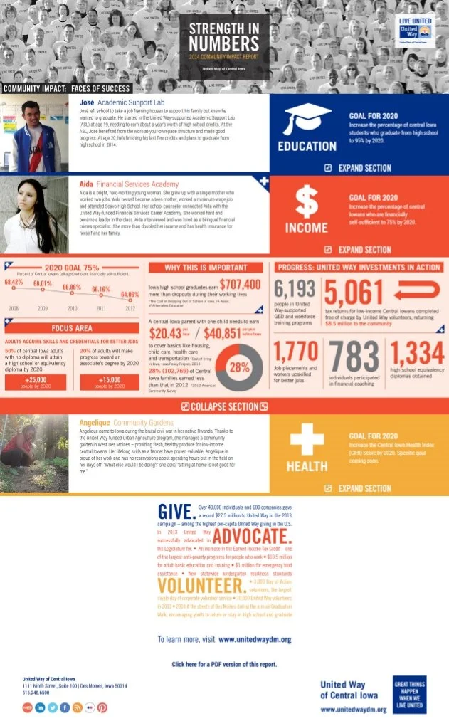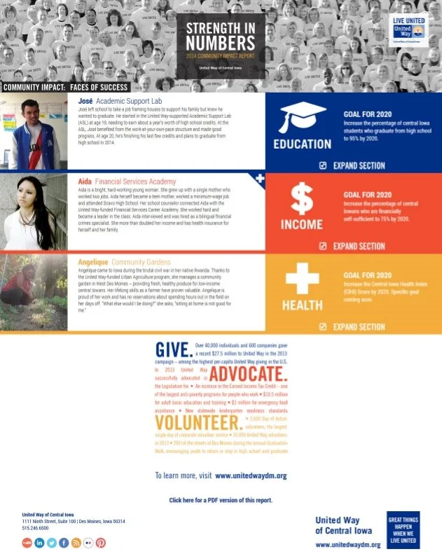 Second, not only is there sufficient information, but there is information that will appeal to everyone. For the number-crunchers, there are statistics about each of the issues that show how prevalent the issue is in central Iowa. For people who like a good story, there are stories about people whose lives have been positively impacted by the programs funded by United Way of Central Iowa. And for people who wonder what to do next, the report shares how people can give, advocate, and volunteer to address these issues through United Way of Central Iowa.