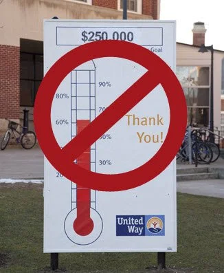 There is no reason why United Ways need a thermometer – none. If your United Way is using thermometers now, please take them down immediately. Replace them with a sign that says “Donating to United Way _____ _______ ________” and fill-in the blanks with something like “helps reduce hunger” or “helps kids graduate.” This is exactly what your donors want to know.