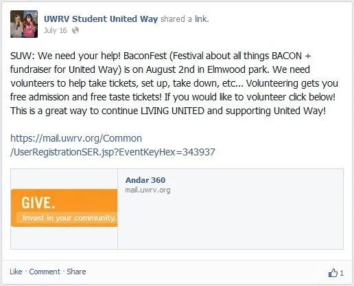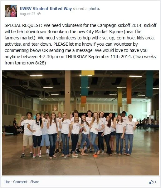 On their Facebook page, they invite students to volunteer for fun events like BaconFest (a festival about bacon and a fundraiser for United Way), where volunteering will get them free admission and free taste tickets. They also invite students to volunteer for their campaign kickoff, and attend and bring their family to the event for dinner, music, and games. They make it fun for the students to get involved and volunteer.