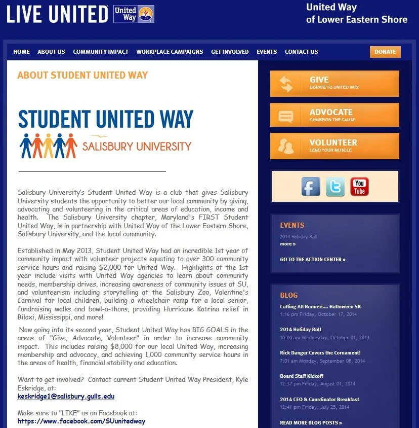 Salisbury University’s Student United Way (United Way of Lower Eastern Shore – Salisbury, Maryland) is fairly new and they are already communicating great things. They include information on their goals for this year and results they achieved last year, including information and pictures about specific volunteer projects, like storytelling at the Salisbury Zoo and building a wheelchair ramp for a local senior. (Check out last week’s blog post, which highlighted this Student United Way’s volunteering efforts and Halloween 5K Dash.)