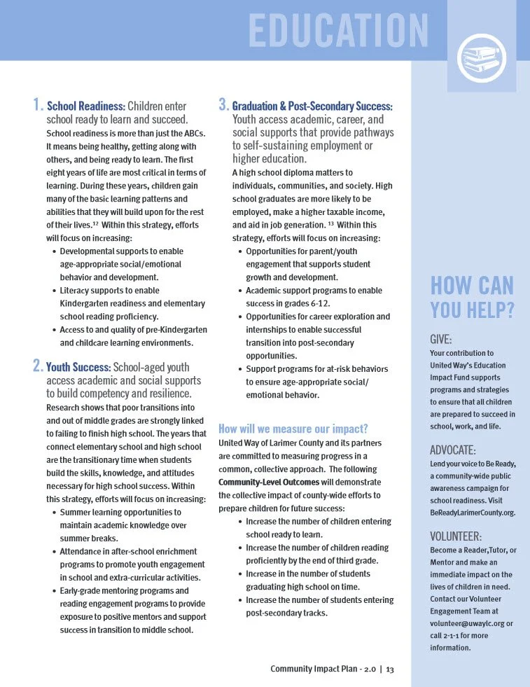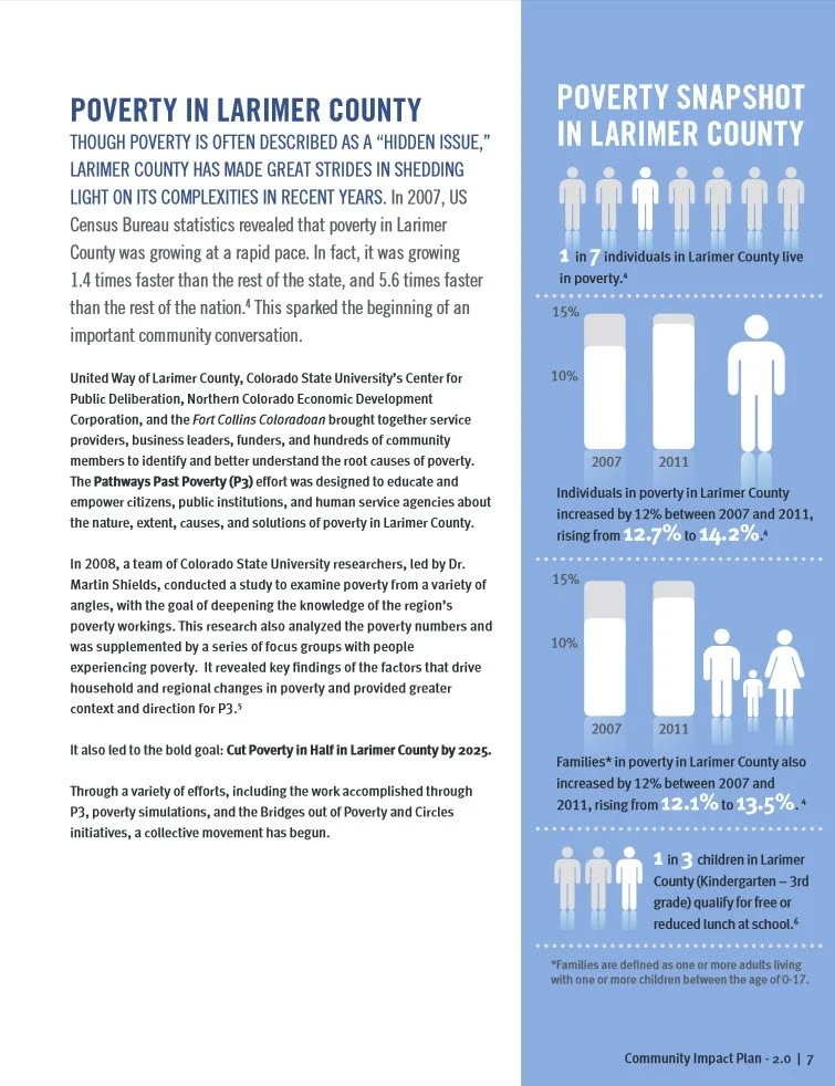 United Way of Larimer County’s Community Impact Plan Version 2.0 includes an explanation of poverty and how it affects residents, the community-level outcomes in the areas of education, income, and health to address poverty, and the opportunities to give, advocate, and volunteer to address poverty in Larimer County.