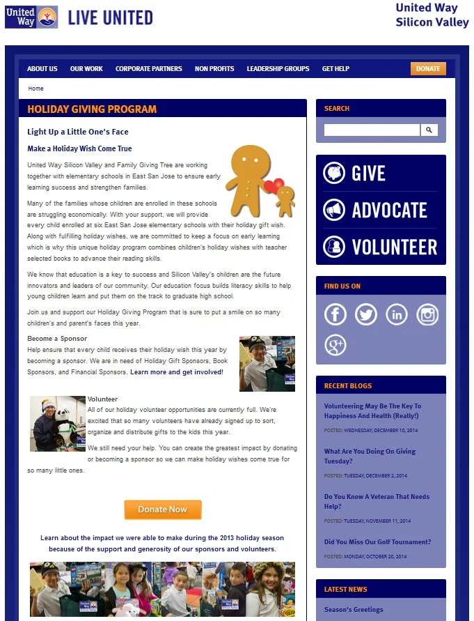 United Way Silicon Valley (San Jose, CA) is working to ensure early learning success and to strengthen families through their Holiday Giving Program. On their Holiday Giving Program Web page, they explain that they are focused on helping families who are struggling economically and helping young children build their literacy skills. They share their goal of providing every child at six elementary schools in the community with their holiday gift wish and a book to advance their reading skills. They include results from last year’s Holiday Giving Program to show that they are making an impact in children’s and families’ lives in the community. They encourage community members to support their Holiday Giving Program by becoming a sponsor, volunteering, or donating.