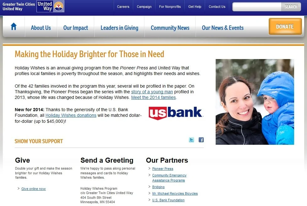 Greater Twin Cities United Way’s (Minneapolis, MN) annual giving program, Holiday Wishes, is dedicated to addressing their issue of poverty in the community. Their Holiday Wishes program profiles local families in poverty throughout the season in the newspaper and on their Web site, and highlights those families’ needs and wishes. Greater Twin Cities United Way received a matching grant for up to $45,000 from the U.S. Bank Foundation this year. On their Web site, they provide a link to a story of a man whose life changed because of Holiday Wishes last year and community members can meet the 2014 families who have holiday wishes this year. Community members are encouraged to give and send a greeting to the families in need.