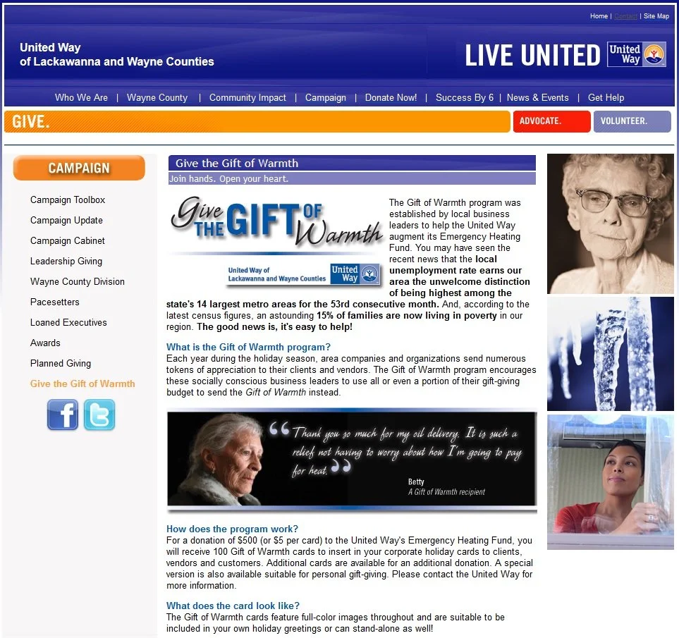 United Way of Lackawanna and Wayne Counties (Scranton, PA) is providing a way for both individuals and companies to give this holiday season through their Gift of Warmth program. They provide statistics about unemployment and poverty in the community and information about how community members can help. They explain that for a donation of $500 (or $5 per card) to the United Way’s Emergency Heating Fund, donors will receive 100 Gift of Warmth cards to insert in their corporate or personal holiday cards. They encourage companies to use their gift-giving budget to send the Gift of Warmth this holiday season when showing appreciation to their clients and vendors, opposed to sending other tokens of appreciation. They explain how donations are used and share results from last year, by sharing individual stories and explaining that 250 families received the Gift of Warmth to overcome potentially life-threatening heating emergencies during the coldest winter months.