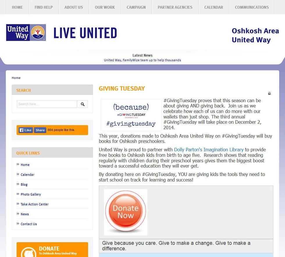 United Ways are also promoting #GivingTuesday and asking people in their communities to give today. I viewed over 100 United Way #GivingTuesday Web pages, most of which had general information about #GivingTuesday and a donate button. Some United Ways had press releases or long paragraphs of information about their United Way, while others had information about the partner agencies they support. Some United Ways offered incentives to give on their Web site, such as a chance to win a car.