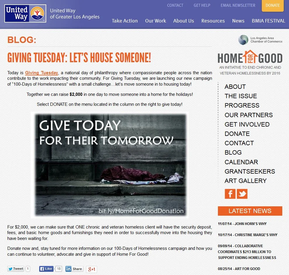 This blog post was actually from last year, but came up in my search. I wanted to share this example because it was one of my favorites. At the very top, it says “Giving Tuesday: Let’s House Someone!” and United Way of Greater Los Angeles explains very simply that by donating, you will help to move someone into a home for the holidays.