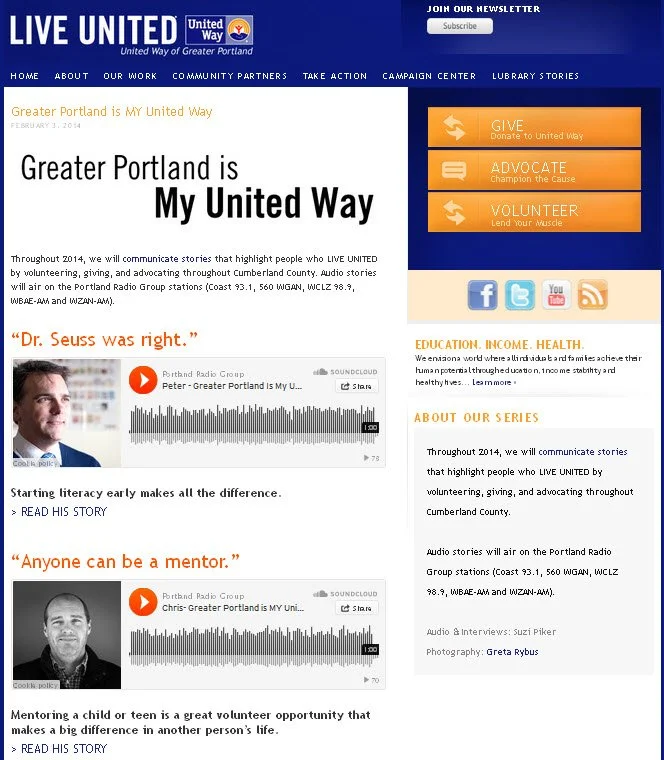 In 2011, United Way of Greater Portland’s CEO/President, Suzanne McCormick, recognized that every organization is a media organization in today’s digital world and began investing in staff and infrastructure to understand and capitalize on the opportunities of the new media landscape. United Way of Greater Portland created the Live United storytelling library (LUbrary) to create and share stories that will increase the knowledge and understanding of United Way of Greater Portland and its work in the community, and the issues affecting Cumberland County.