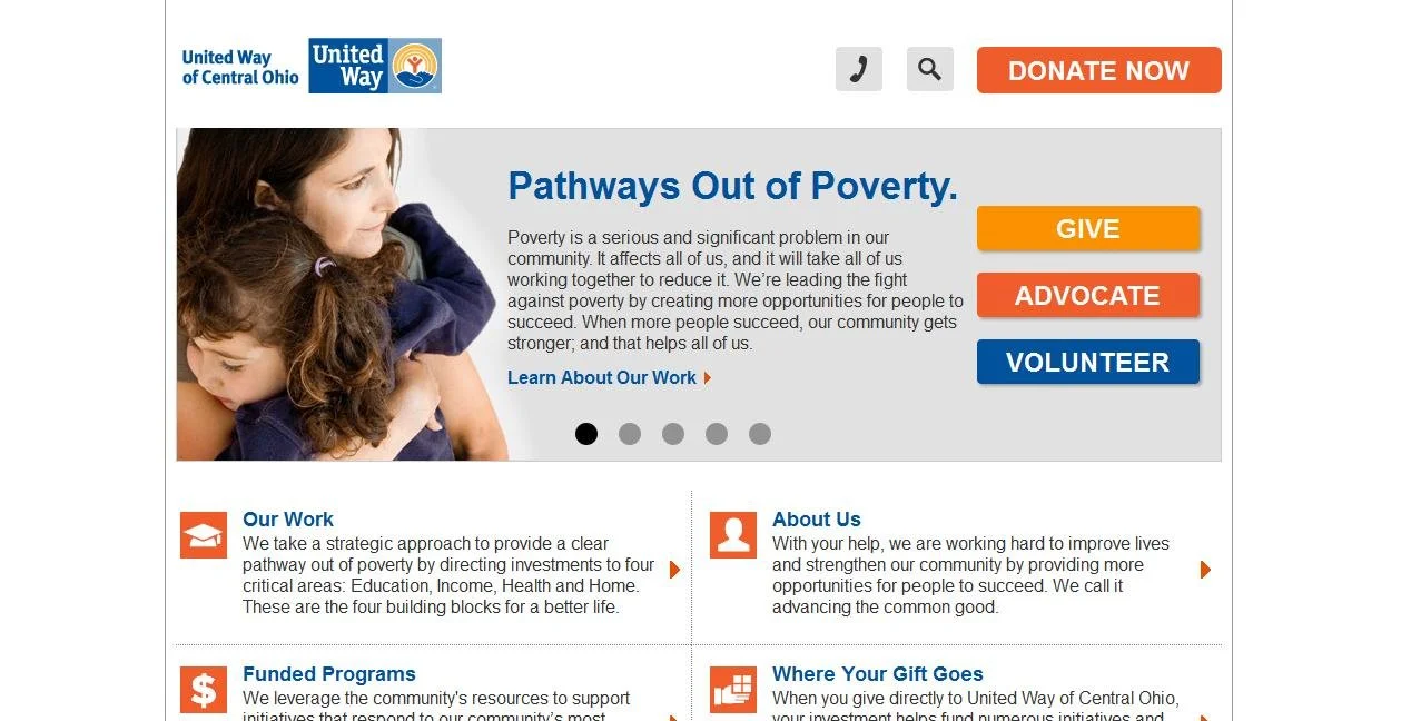 At the top of the homepage of their Web site, it says “Pathways Out of Poverty” and there is an explanation about the issue in the community and how United Way of Central Ohio is leading the fight against poverty. You can click to learn more about their work or to learn how you can give, advocate, or volunteer. They explain how the “four building blocks of a better life” are critical elements in creating pathways out of poverty.