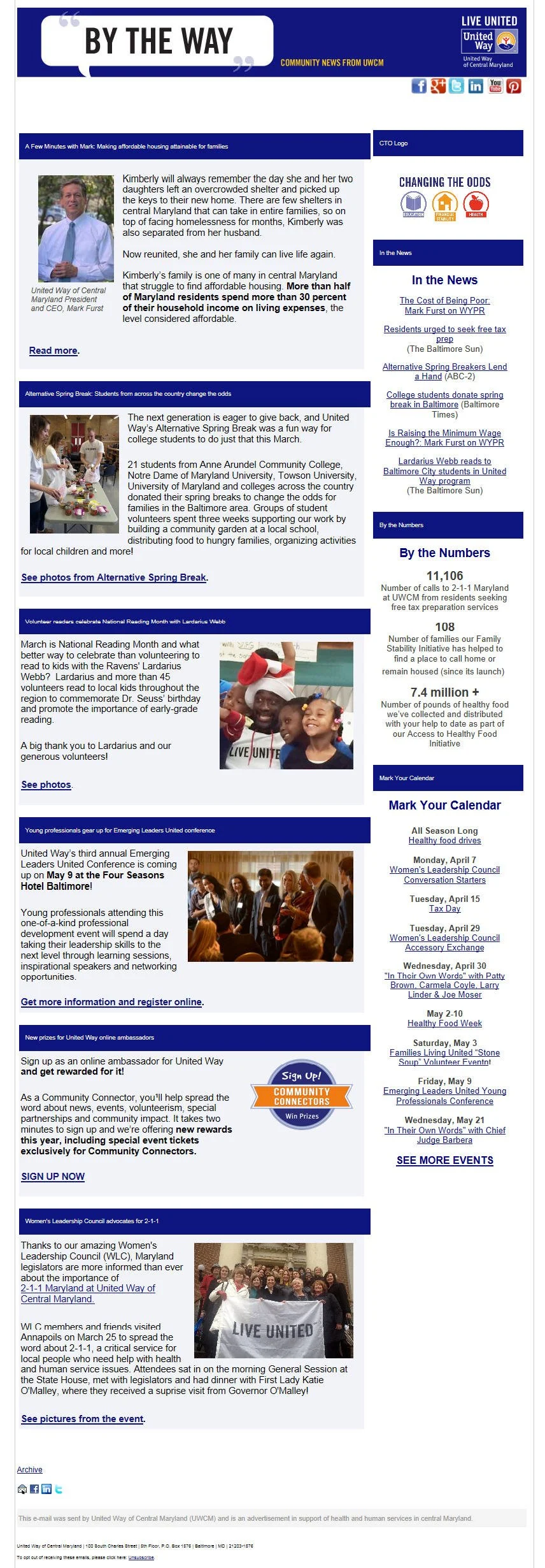 Their “By The Way” newsletter is a one-page newsletter that includes several articles, along with listings of statistics and events. Each article has a picture or logo to draw the reader’s attention. This newsletter from March 2014 is the most recent newsletter, published by United Way of Central Maryland every three months. There are links to the past 17 newsletters on their Web site.