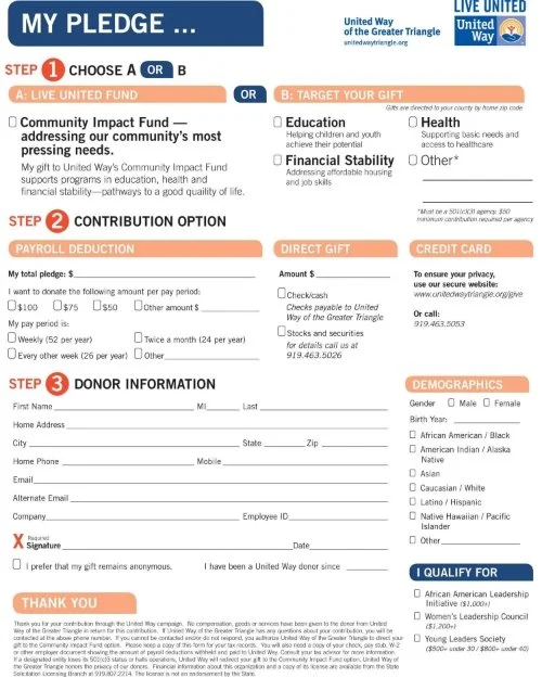 Once again, workplace campaign season is in full swing for many United Ways. The pledge form is one of those workplace campaign essentials every United Way prepares as a matter of necessity, often without a lot of thought. One United Way that has thought about the donor when preparing their pledge form is United Way of the Greater Triangle (Morrisville, North Carolina).