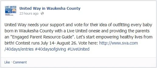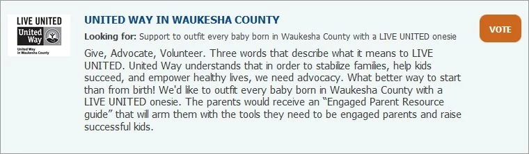 United Way in Waukesha County (Waukesha, Wisconsin) wants to make an effort to connect with young people in their community and in their words said “What better way to start than from birth!” Their United Way entered SVA’s 40 Days of Giving contest and they are asking people to vote to help their United Way win a chance to outfit every newborn in their community in a Live United onesie.