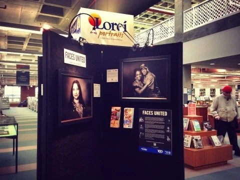 Joelyn Bush, Marketing & Communications Manager for United Way of Erie County, explained that Faces United is a series of photos and stories that are displayed in an art exhibit format at locations throughout Erie County. The exhibit has appeared at the regional mall, library, local newspaper, large employers, and a local university. The exhibit is displayed for approximately one month before it is moved to the next location. The photo shows part of the exhibit at the local library.