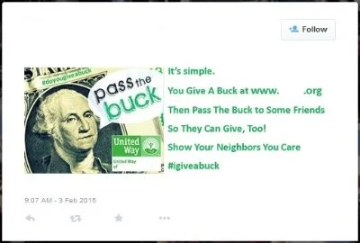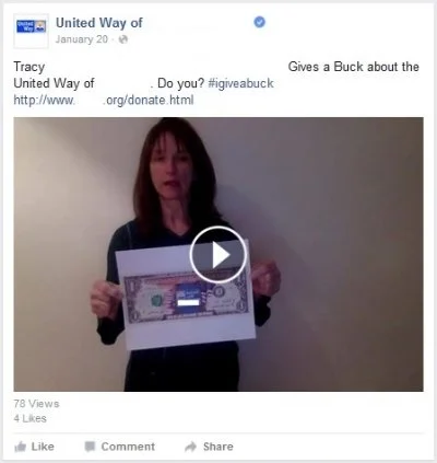 A similar fundraiser was done by a United Way. They invited people to “Give A Buck” and then “Pass The Buck” by posting a video on social media about why they donated to United Way and encouraging their friends and family to donate, as well.