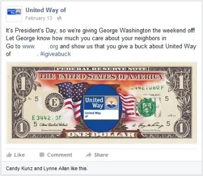 This description isn’t dissimilar to how other United Ways describe what they do. United Ways do a lot of great things and it can be difficult to communicate a focused message. When you do your social media fundraiser, communicate about a single issue, such as: hunger, homelessness, school readiness, etc. Your message for the fundraising campaign could be something like “Give a buck to United Way of ____ to help end hunger in our community.” Remember, it is better to be known for one thing, rather than nothing at all, and people will be more likely to give if they understand what their donation supports.