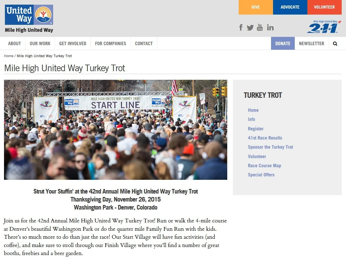 Mile High United Way has been promoting this event on their Web site, Facebook, and Twitter. On Twitter, they also encouraged people to shop at Denver Whole Foods stores on Wednesday, November 18th to support the Mile High United Way Turkey Trot. They have also been inviting people to volunteer.