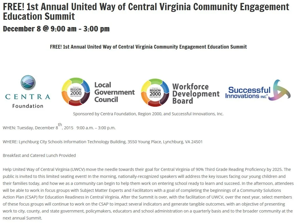 Second, they are acting as a convener in their community and recently held their first annual 2015 Education Summit. United Way of Central Virginia invited their community to help them move the needle toward their goal for Central Virginia of 90% Third Grade Reading Proficiency by 2025. Nationally-recognized speakers addressed the key issues facing children and families, and discussed how the community can begin to help them work on entering school ready to learn and succeed. Attendees were invited to work in focus groups with subject matter experts and facilitators with a goal of completing the beginnings of a Community Solutions Action Plan for education readiness in Central Virginia.