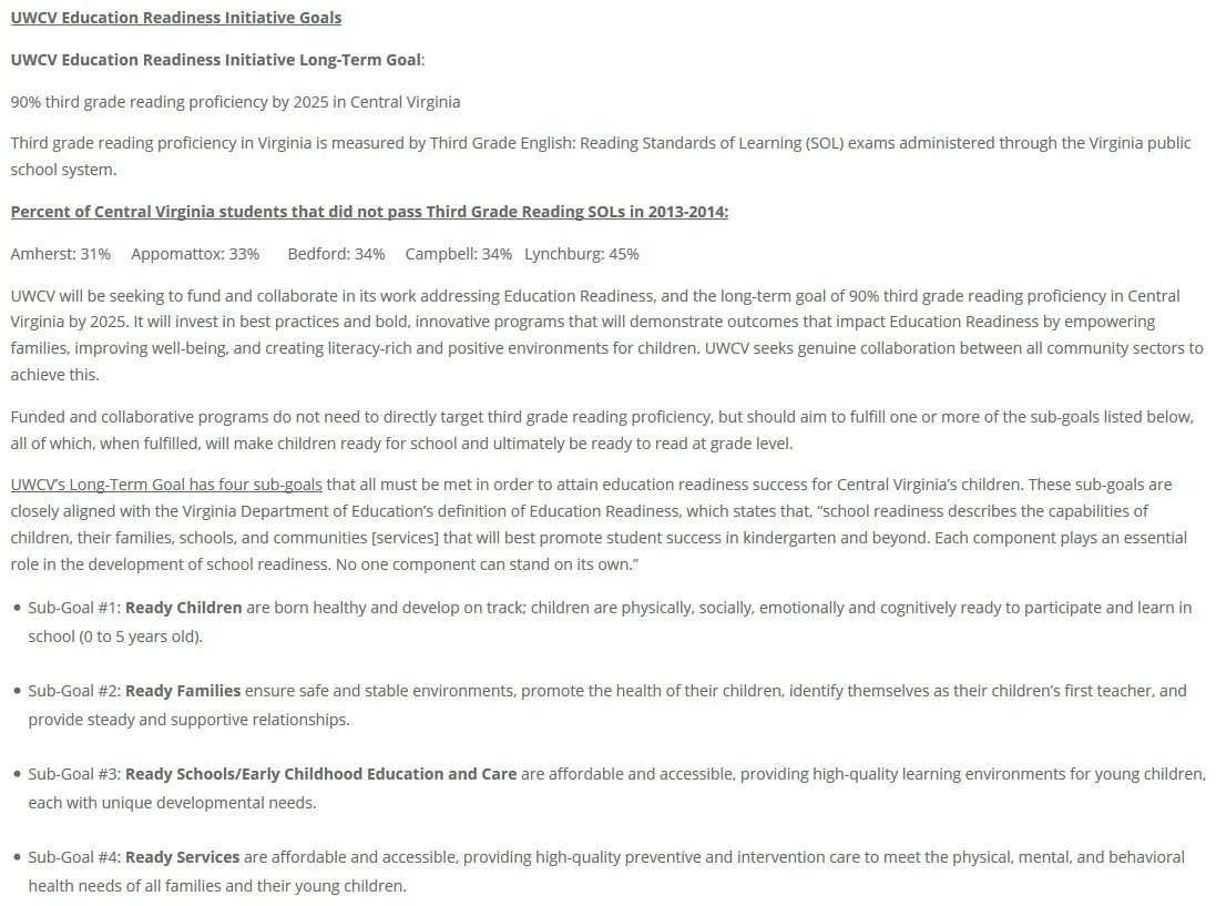 United Ways across the country are continuing to move their community impact efforts forward. Many United Ways focus on categories, such as education, income, and health, and some United Ways focus on a specific issue, such as poverty, homelessness, or hunger. United Way of Central Virginia (Lynchburg, Virginia) has taken the next step on their community impact journey by focusing on the issue of education readiness.