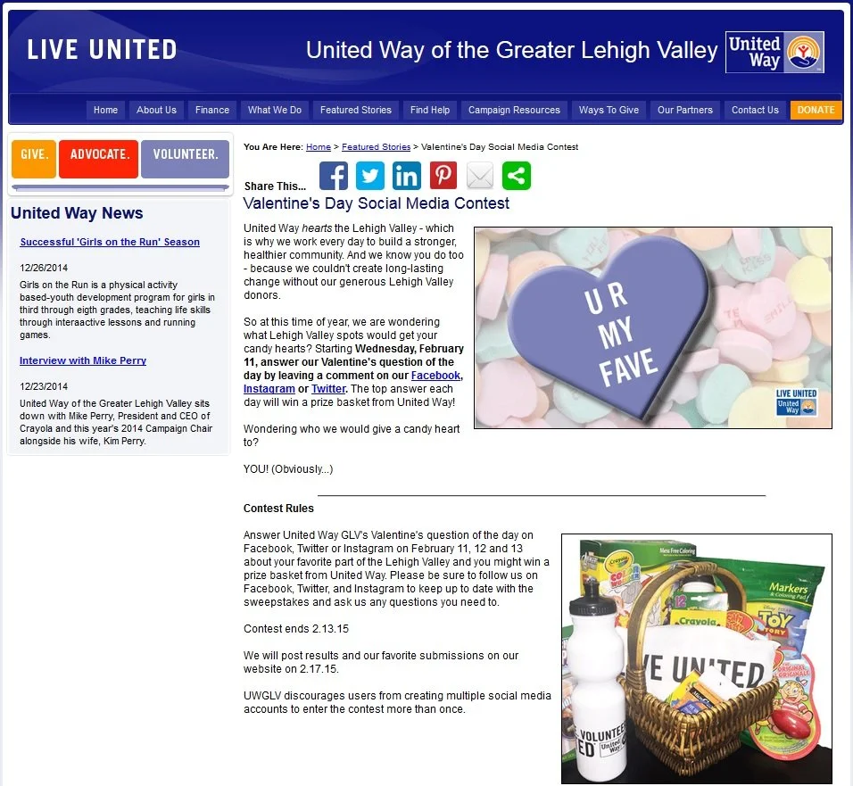 United Way of the Greater Lehigh Valley (Allentown, PA) is inviting their donors and community members to answer the Valentine’s question of the day on Facebook, Twitter, or Instagram on February 11, 12, or 13 about their favorite part of the Lehigh Valley for a chance to a win a prize basket from United Way of the Greater Lehigh Valley. Their Valentine’s Day Social Media Contest engages donors and community members, while showing them they care this Valentine’s Day by giving away prize baskets.