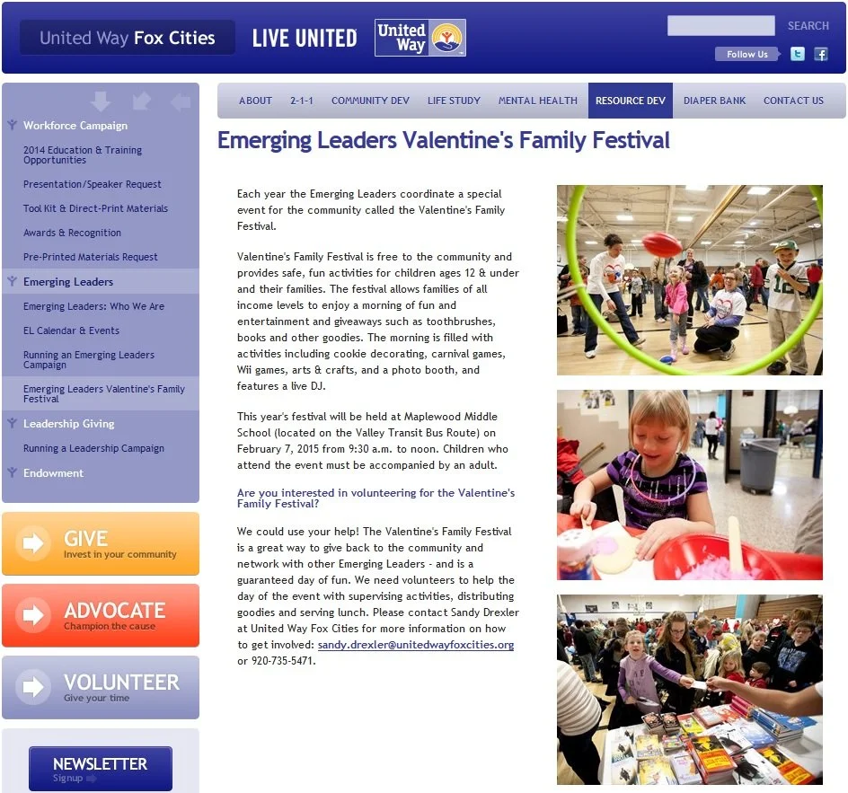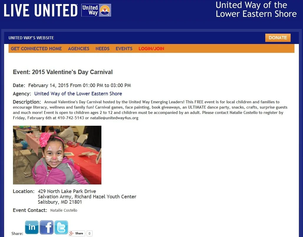 Emerging Leaders groups at United Way Fox Cities (Menasha, WI) and United Way of the Lower Eastern Shore (Salisbury, MD) are hosting Valentine’s events for their community members. United Way Fox Cities’ Emerging Leaders are hosting their annual Valentine’s Family Festival, which is a free event for children and their families to enjoy activities like cookie decorating, carnival games, Wii games, arts and crafts, and a photo booth. They are also giving away toothbrushes and books, and providing a free lunch. United Way Fox Cities is not only promoting the event on their Web site, but they are also promoting the need for volunteers to help at the event by supervising activities, distributing goodies, and serving lunch. One of the Emerging Leaders wrote about the event and said typically about 500 kids and their parents attend this event, and thanks to a grant from Depend® this year, each child will receive a literacy kit and will be sent home with a healthy meal to make with their family. This event connects United Way with the community by inviting them to attend or volunteer for the event.