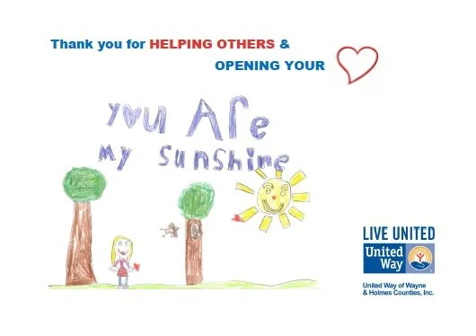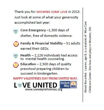 United Way of Wayne and Holmes Counties (Wooster, OH) sent Valentine’s Day cards to donors last year, thanking them for helping others. The front of the card included a picture drawn by a student in the community and the inside of the card included information about the impact of donors’ contributions, such as: 51 adults earned their GEDs and 2,126 individuals had access to mental health counseling. They are thanking donors and communicating results about how donors’ contributions are making a difference in the community.