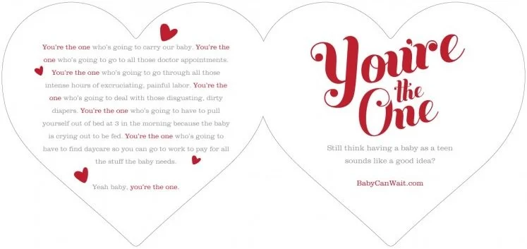 United Way of Greater Milwaukee (Milwaukee, WI) also gave out Valentine’s Day cards – however, their cards had a different message and were handed out to local teens, as part of their teen pregnancy prevention campaign. Their “Baby, You’re the One” campaign used bus shelter and radio ads, in addition to the Valentine’s Day cards, to show how boys might seduce and mislead their girlfriends. Hundreds of Valentines were distributed to high school students at bus stops before and after school to get teens to think about the position they will be in if they get pregnant. Their Valentines communicate about a specific issue and connect that issue to United Way.