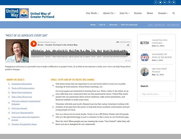 Third, United Way of Greater Portland includes a sound clip from an interview with a local resident. This makes their request to advocate very personal as it provides an example of someone who says “Most of us advocate every day.” This sound clip helps encourage people to take the first step. This sound clip is part of United Way of Greater Portland’s LUbrary, which includes lots of stories about the people and work of United Way of Greater Portland. We highlighted their LUbrary in a previous blog post.