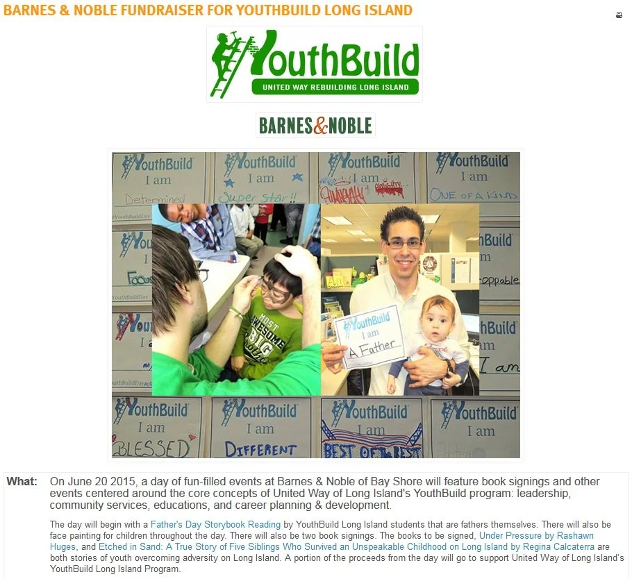 United Way of Long Island (Deer Park, NY) partnered with Barnes & Noble of Bay Shore for a fundraiser for their YouthBuild Long Island program. They invited their community to take action by either attending the fundraising event or giving to their YouthBuild Long Island program at another Barnes & Noble store or online.