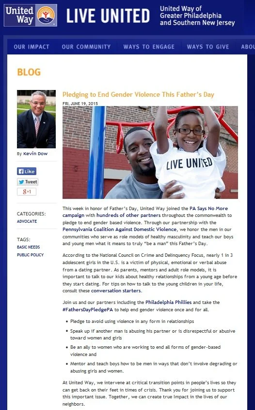 United Way of Greater Philadelphia and Southern New Jersey (Philadelphia, PA) joined the PA Says No More campaign to pledge to end gender-based violence, in honor of Father’s Day. They invited their community to take action by joining them in taking the #FathersDayPledgePA to help end gender violence on their Web site, Facebook, and Twitter.