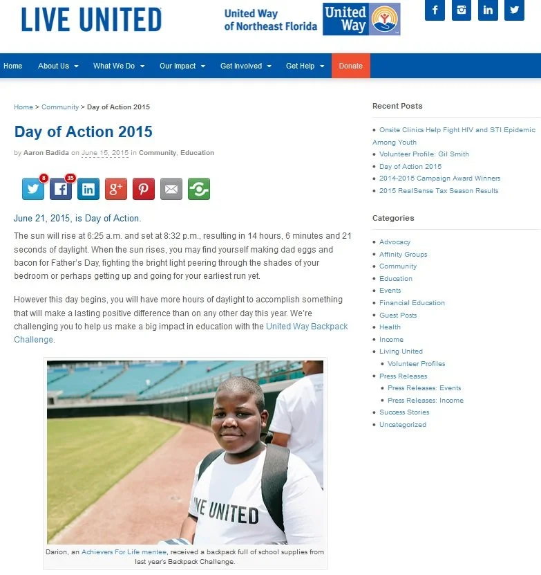 United Way of Northeast Florida (Jacksonville, FL) invited their community to take part in United Way’s Day of Action to help make a big impact in education with their United Way Backpack Challenge, which ensures students in Northeast Florida go back to school with the tools they need to succeed. They encouraged community members to help them fill as many clear or mesh backpacks with school supplies as possible to donate to Achievers For Life schools or United Way Full Service Schools resource centers. They included a suggested timeline for United Way’s Day of Action on their Web site, which included making breakfast for your dad for Father’s Day, heading to the nearest store to load up on school supplies, and tweeting a picture to @unitedwaynefl with #DayofAction to encourage others to get involved. They promoted United Way’s Day of Action and their Backpack Challenge on Facebook, Twitter, and Instagram.