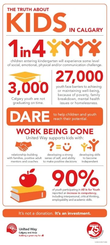 Second, United Way of Calgary and Area used local statistics like 3,000 Calgary youth are not graduating on time, and 27,000 youth face barriers to achieving or maintaining well-being because of poverty, family breakdown, mental health issues or homelessness. These local statistics are important because they demonstrate to the reader that these are significant problems and challenges locally. When United Ways use national statistics on their infographics, the reader may be inclined to dismiss the information because they think the problem only exists in other places and not in their community. Locally statistics are the first choice for any infographic if you have them like United Way of Calgary and Area.