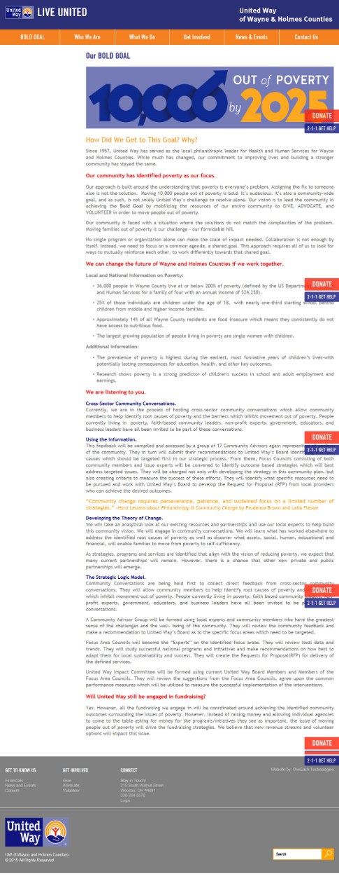 First, they clearly talk about the need to address poverty and why United Way needs to change. There are statistics and information about the significance of poverty in Wayne and Holmes Counties, and the impact of poverty on children and their educational success. These statistics clearly demonstrate the magnitude of the challenge of poverty and the importance of trying to reduce poverty in Wayne and Holmes Counties. There is also a brief explanation of why United Way of Wayne and Holmes Counties is changing from a fundraising organization to a leader in bringing the community together to focus on a shared goal of moving 10,000 people out of poverty by 2025. There is a great sentence at the bottom of the page which explains this change: “Instead of raising money and allowing individual agencies to come to the table asking for money for the programs/initiatives they see as important, the issue of moving people out of poverty will drive the fundraising strategies.”
