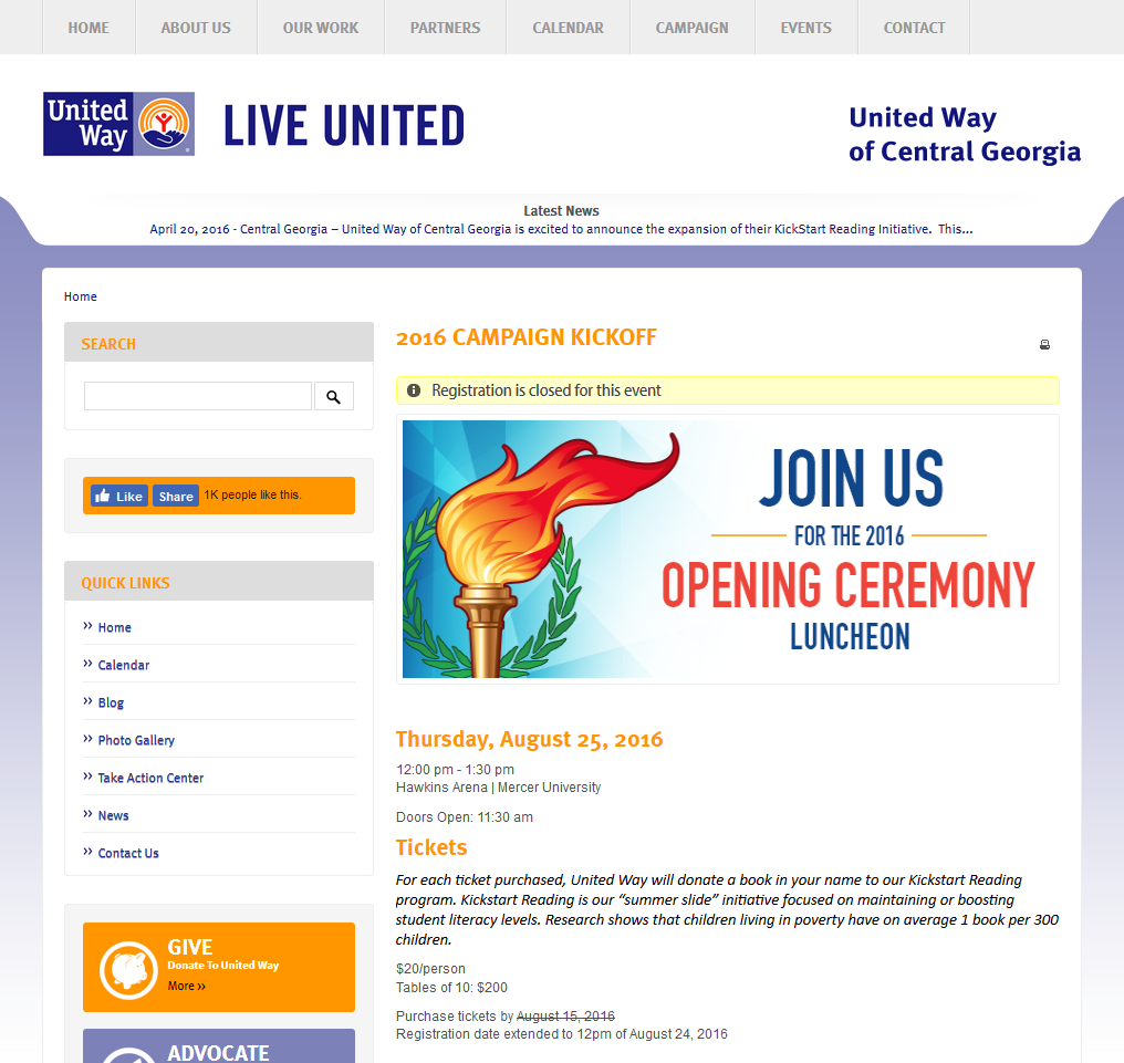 United Way of Central Georgia (Macon, GA) communicated the impact their donors and community would make by attending their campaign kickoff last month. For each ticket purchased, United Way of Central Georgia said they would donate a book in the person’s name to their Kickstart Reading program, which is their "summer slide" initiative focused on maintaining or boosting student literacy levels. They explained the importance of providing these books on their campaign kickoff Web page, saying "Research shows that children living in poverty have on average 1 book per 300 children."
