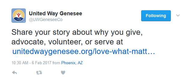 One United Way that is promoting storytelling this month is United Way of Genesee County (Flint, MI). They have a webpage called "Love What Matters" on their website and they are asking community members who support their United Way through giving, volunteering, or serving to share their story.