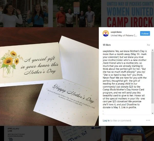United Way of Pickens County (Easley, SC) encouraged people in their community to give the gift of reading this Mother’s Day with their Women United Camp iRock Honor Card Program. By making a $25 donation to Camp iRock, you could send a Mother’s Day card to your mom, letting her know you made a gift in her honor.