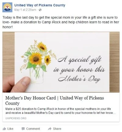United Way of Pickens County promoted this opportunity to give and make an impact in honor of your mom on their website and social media.