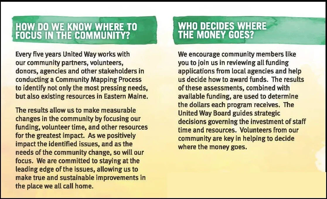 Even worse is the fact that United Ways find a way to talk about their processes everywhere. United Ways have found ways to include their processes in campaign presentations, campaign brochures, campaign videos, websites, annual reports, and news articles. Here are just a few examples: